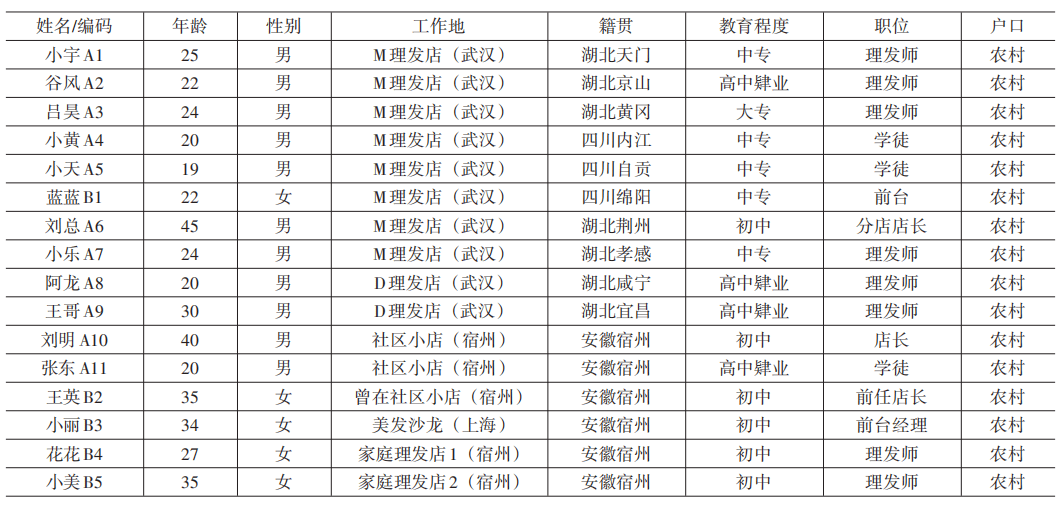 作为一项质性研究,本文采取的主要研究方法是访谈法和参与式观察。我们首先是作为理发店的顾客,在消费过程中通过攀谈(包括诉诸“老乡”关系)的方式与理发师和其他工作人员建立关系。同时,我们通过寻找中间人来详细了解理发店的内部运作。访谈对象主要包括理发师、学徒、前台小妹、店长、顾客(未放入信息表)。资料主要通过多次无结构式访谈、半结构式访谈以及日常对话收集得来,访谈时间基本为2至3小时。虽然大型理发店中的女理发师寥寥无几,我们仍利用“滚雪球”的方式采访了几位女性。我们有意识地选择差异化的访谈对象,以增强研究结论的代表性。从2021年10月至2023年4月,我们在武汉与宿州两地进行了为期一年多的田野研究。在访谈的同时,我们还在理发店进行了持续的参与式观察,尤其是近距离观察理发师刘明和阿龙的工作,每次时间长达一天。除此之外,我们还对上海的一家理发店进行了简短的调研。