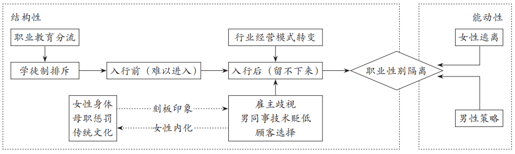 我们具体分析了理发业的相关特点、理发师的教育与劳动过程,指出原因不仅在于外部结构的客观限制,还在于劳动者个体的主动与被动选择。女性在入行前就遭受了结构性的种种限制,职业性别隔离已然产生。在职业教育时期,由于教育特性与传统偏见,造成职业教育中女性流失严重,专业设置又让女性分流到更符合社会性别角色的专业中去。与此同时,学徒制是理发业仍坚持的重要学习制度,其入行门槛往往依赖于亲戚朋友所构建的紧密社会网络关系。然而,受限于信息的同质化以及传统文化的深远影响,女性群体在这一行业内逐渐遭受边缘化。而入行后,由于经济体制与行业变迁的影响,女性在激烈的就业市场上遭受的性别歧视是造成职业性别隔离的根本原因。这反映了深层次的性别权力问题。由于身体特征和生育特点,女性在求职过程以及职场中经常面临多种形式的歧视。男性同事通过刻意贬低女性的技术和能力,进行性别划界,甚至会利用性别的刻板印象造成制度性的排斥。同时雇主更青睐能“吃苦赚钱”的农村男性,认为女性很难同时兼顾工作与家庭,而顾客也在行业设置下固化了对女性的刻板印象。在这样的多重压力下,女性不得不选择逃离,早早退出劳动力市场。